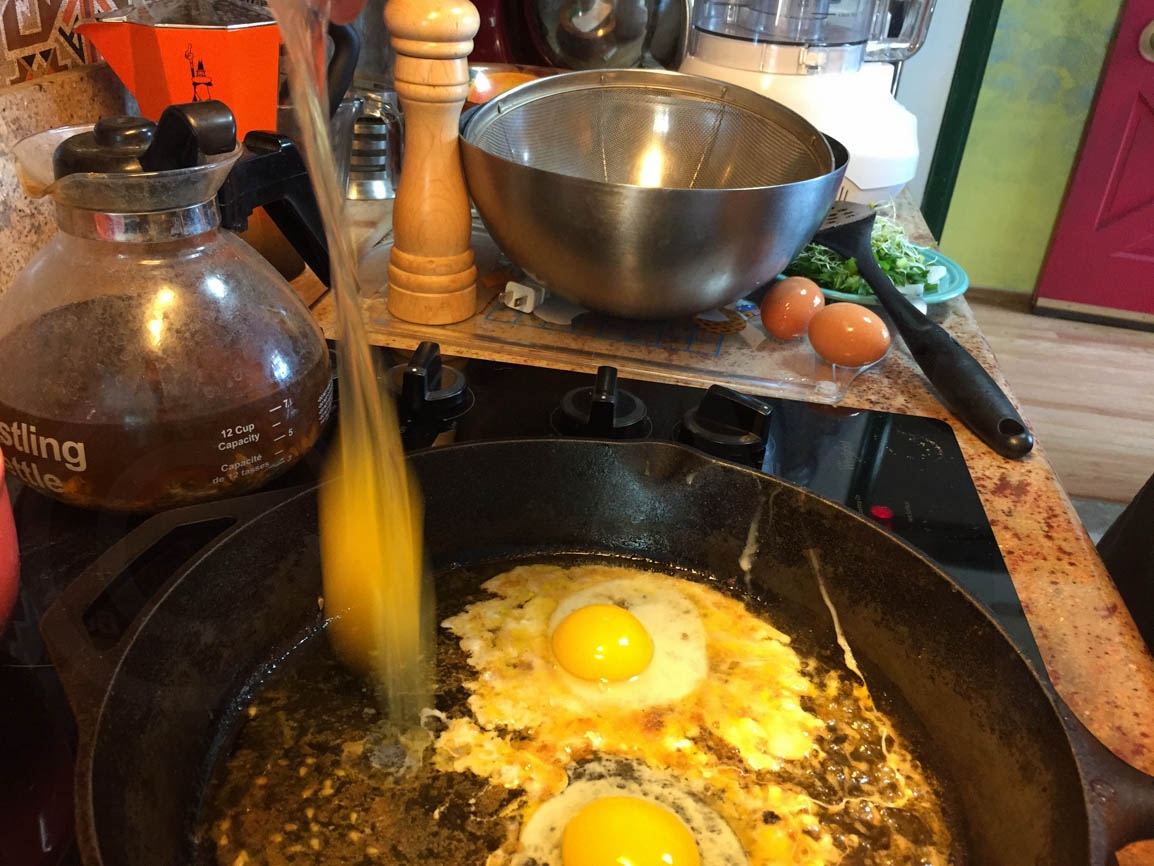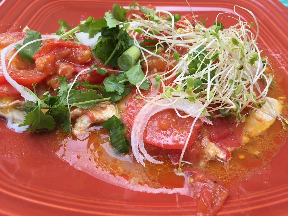 Garnish with greens (onions, parsley, sprouts, etc.).