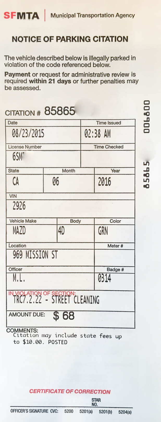 A short complaint letter to SFMTA after a street cleaning citation in San Francisco.