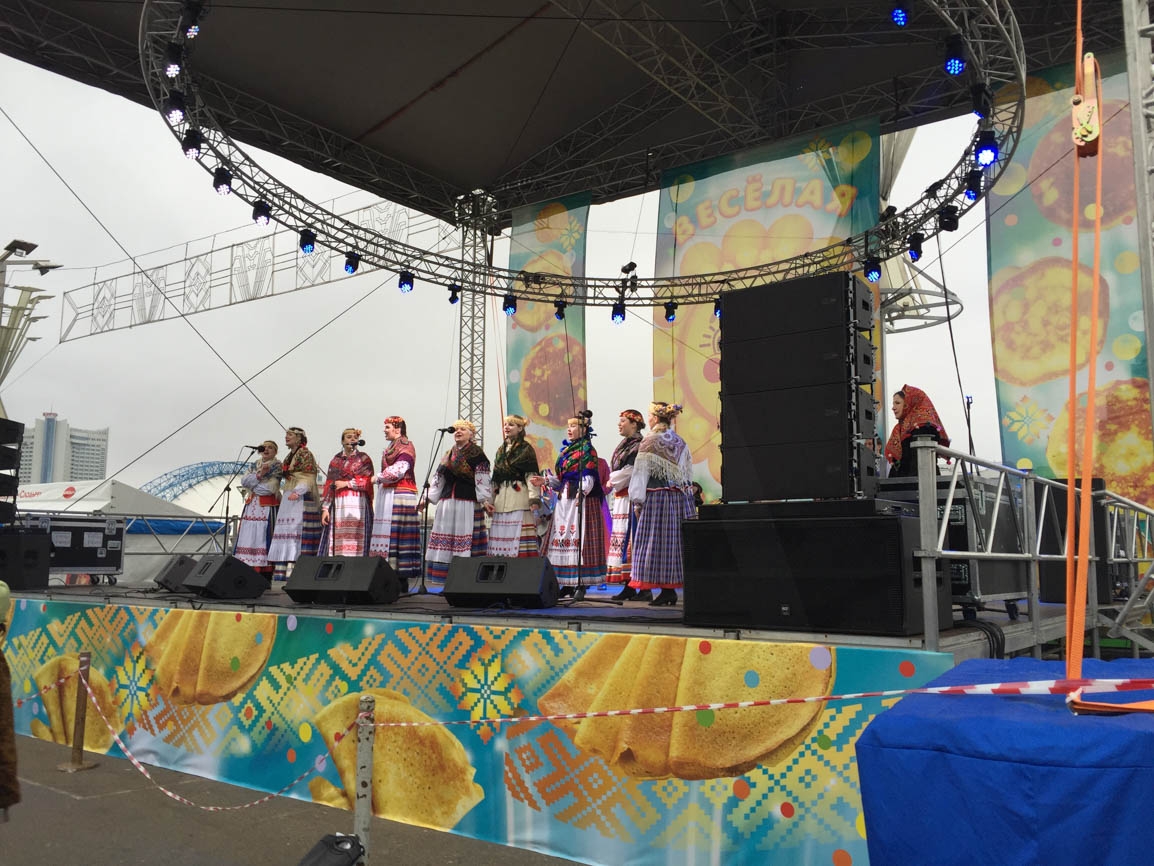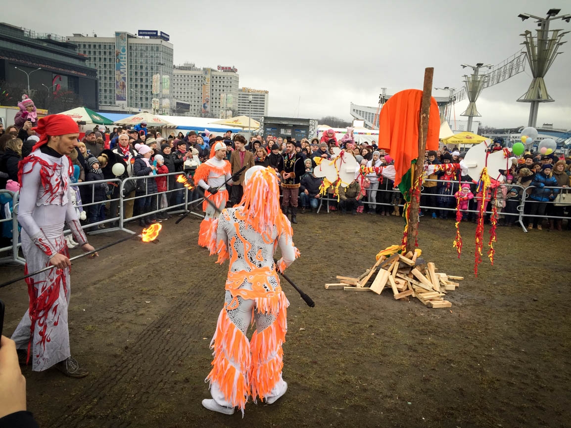 Despite a very strong wind and light rain, the streets were full of people who wanted to try fresh bliny, to listen to folk music, and to burn a beast.